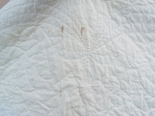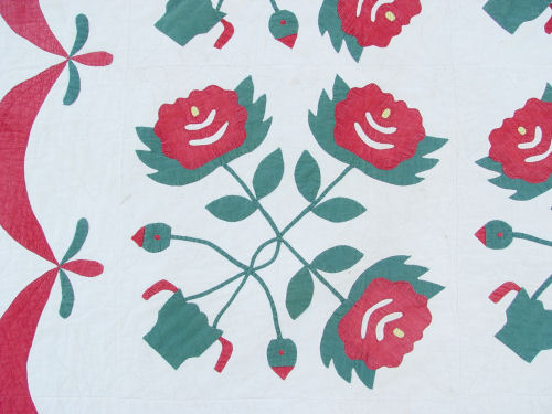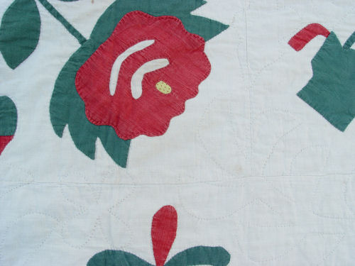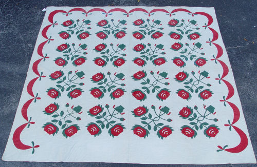 HAND QUILTED AND APPLIQUE RED & GREEN ROSE QUILT: The top constructed of 16 squares of three roses. Unusually large at 96'' x 98''. We did not launder this quilt.