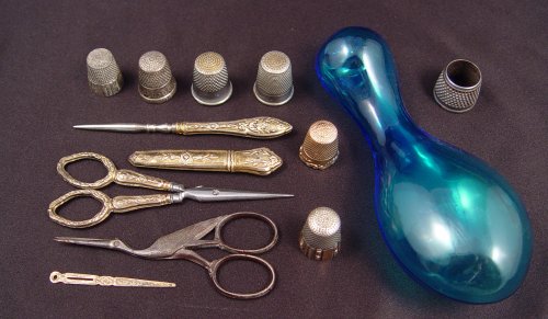 SEWING TOOLS, THIMBLES & GLASS DARNER: Includes Continental silver hallmarked set (punch, scissors, threader, and needle holder), 3 sterling thimbles (one monogrammed), gold toned thimble (monogrammed), 3 other metal thimbles, and glass darner.
