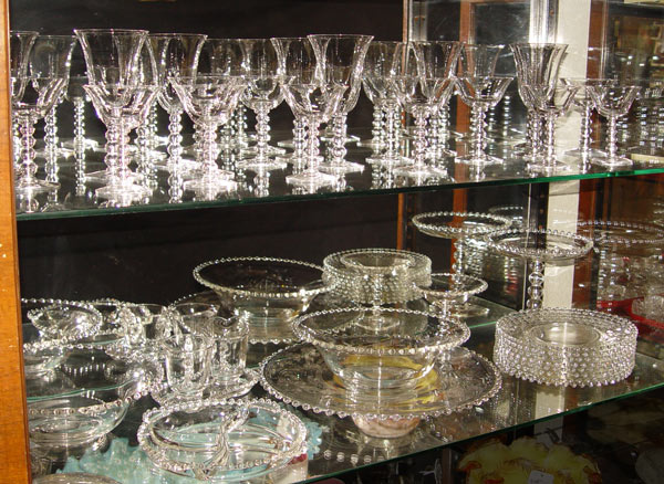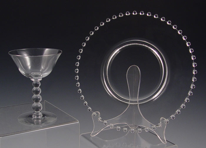 LARGE GROUP OF IMPERIAL CANDLEWICK GLASSWARE: 37 pieces to include the silver overlay torte dish (14''), 7'' comport, 5'' comport, 2 serving bowls (10'' dia.), cream and sugar with the tray, 8 plates (9'' dia,), 8 stems (7 1/4''), 7 stems (5''), and 6 stems (4 1/2'').