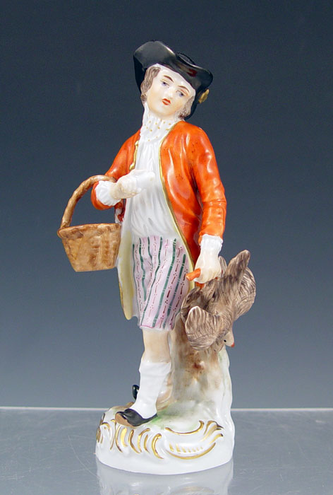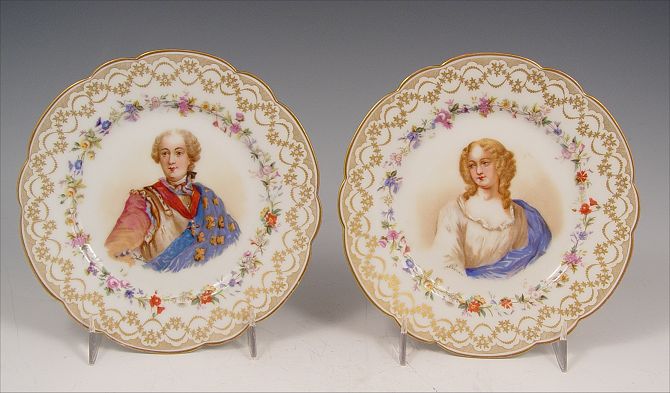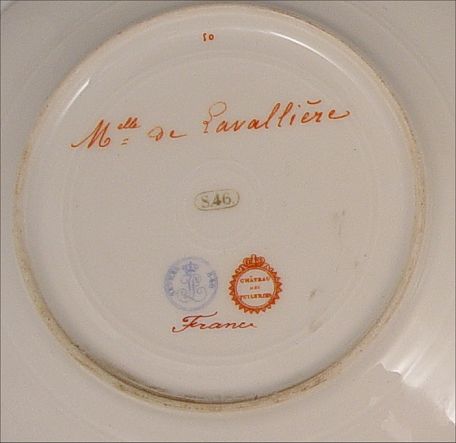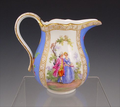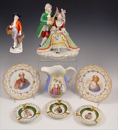 8 PIECE ESTATE COLLECTION OF SEVRES, DRESDEN AND LIMOGES: 1) Carl Thieme Dresden figurine of man with chicken and eggs, 6''h. 2) German porcelain courting scene figural group, 8 3/4''. 3) Meissen cream pitcher, cross swords mark scratched through, 5 1/4''h. 4-5) Sevres Chateau de Tuileres portrait plates depicting Mme. de Lavalliere and Louis XV., 6 dia. 6-8) Set of 3 Napoleon and Josephine portrait ashtrays by Limoges, 4'' dia.