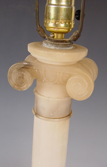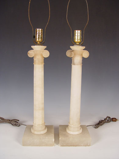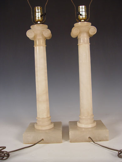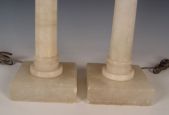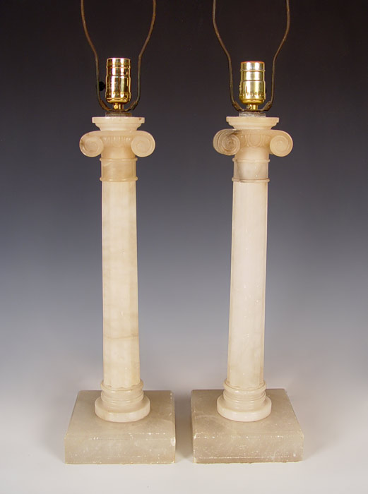 PAIR TALL IONIC COLUMNAR ALABASTER LAMPS: Body measures 18 1/2'' high x 6'' square base. Overall 30 1/2''