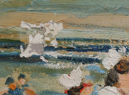 HRISTOFF, Dimiter, (Bulgarian, 1926-): Figures on the Beach, OIL/Canvas, 24'' x 20'', signed, framed, 33'' x 28 1/2''. Dimiter Hristoff was born in 1926 in Sofia, Bulgaria. His childhood was spent between the two cities of Sofia (where he was studying and living with his grandparents) and Istanbul (where his parents lived). The turbulent early 1940's in Bulgaria forced the young Dimiter to abandon his studies and to relocate full time to Istanbul, where he finished his last year of High School at the French Lycee. Upon his graduation, Hristoff applied to and was accepted at the Istanbul Academy of Fine Arts (now called Mimar Sinan University). There he studied in the ateliers of the early Turkish Modernists Zeki Faik Izer and Ibrahim Cali, as well as working privately with the great Turkish artists Ali Sami Boyar and Hayri Cizel, who were close friends of his father (also a painter). The young artist's circle included the literary, artistic and political figures that helped shape the identity of the (then)