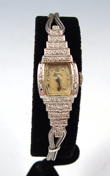 14K LADIES DIAMOND HAMILTON WRISTWATCH: 14K white gold lady's Hamilton wristwatch. Cushion shaped silver-tone dial with foxing. Applied markers. Mechanical jeweled movement. The watch is running. Fancy diamond lugs contain 52 round single cut diamonds. Weight: .25 Ct. Approx. The diamonds average VS in clarity and H-I in color. 14K white gold cable bracelet with safety chain. Weight: 14.1 grams.