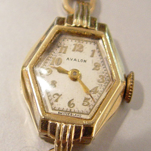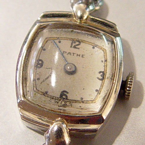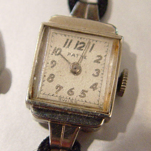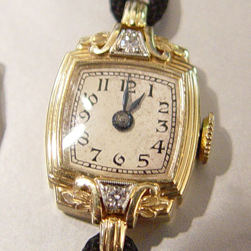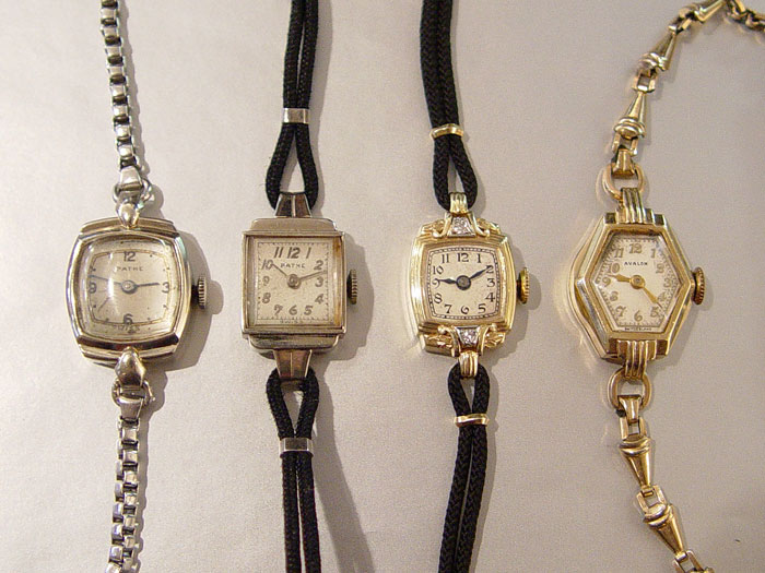 4 PIECE GROUP OF 14K LADIES WRISTWATCHES: 1) Nicolet 14K and diamond watch with 17 jewell movement, dial shows aging, needs cleaning to work, black cord band. 2) Pathe 14K white gold watch, dial shows aging, Swiss 17 jewel movement, currently running. 3) Pathe 14K watch, appears to never have been worn new old stock, original paper tag, black cord band. 4) Avalon 14K gold watch , 17 jewel movement, needs cleaning to work, link style gold filled band with ratcheting clasp.