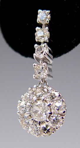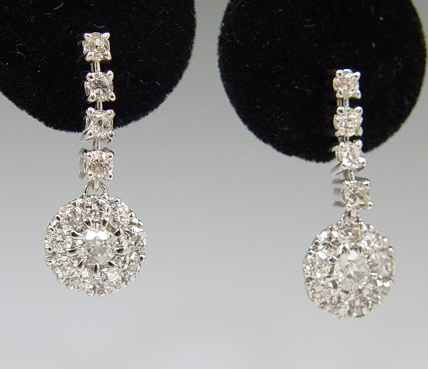 14K 2.50 CTW DIAMOND DROP EARRINGS: 14K white gold earrings contain 28 round full cut, single cut, old mine cut and old European cut diamonds. Total weight approx. 2.50 Ct. The diamonds average VS-SI in clarity and I-J-K in color. The diamonds are prong set. Post and nut closures. Weight: 4.6 grams.