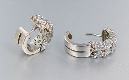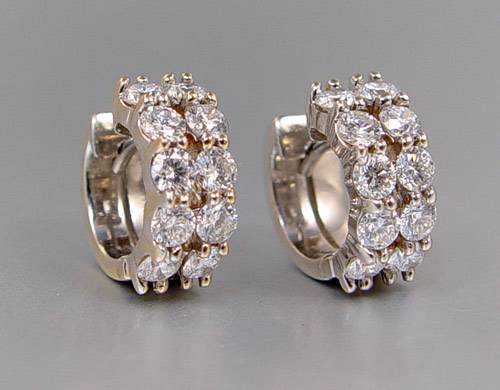 18K DIAMOND HUGGIE EAR HOOP EARRINGS: 18K white gold earrings contain 20 round brilliant cut diamonds, approx. total weight of 1.80 Ct. Rated SI1-SI2 in clarity and G-H-I in color. The diamonds are prong set. Weight: 7.6 grams.