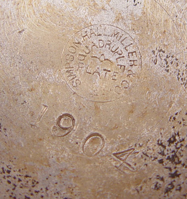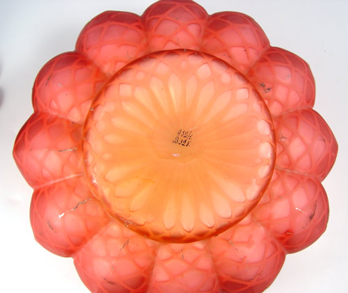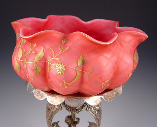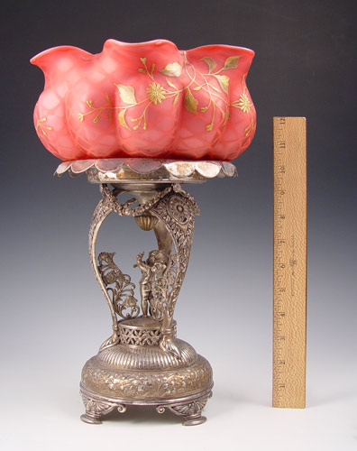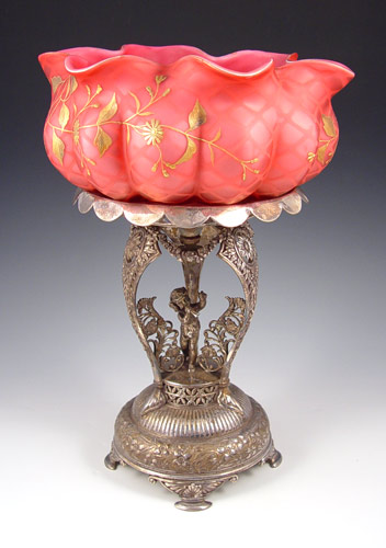 VICTORIAN CRANBERRY SATIN QUILTED MOTHER OF PEARL ART GLASS BRIDES BASKET: Gilt decorated exterior, melon ribbed body. Rests in an elaborate cherub figural Simpson Hall & Miller silverplated stand. The bowl is 9 1/2'' dia. x 4 3/4''h. The stand is 10 1/2'' h. . Overall 15 3/4'' tall.
