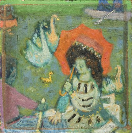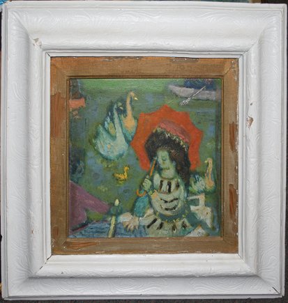 MODERNIST STUDY OF A WOMAN WITH A PARASOL: Boat ride on the lake with swans, Oil/Masonite, 10 3/4'' x 10 3/4'', illegibly monogram lower right PS?, encased in carved and painted frame with wear, 19'' x 19''.