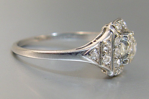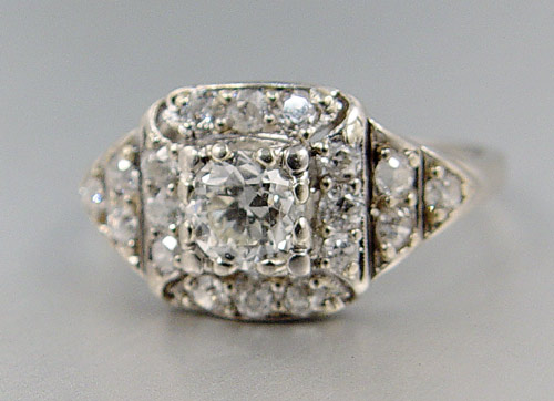 ART DECO PLATINUM OLD EUROPEAN CUT DIAMOND RING: Platinum ring contains 1 old European round cut diamond. Weight: .50 Ct. Approx. Rated VS2 in clarity and J in color. 18 old European round cut diamonds. Weight: .75 Ct. Approx. Rated VS-SI in clarity and H-I in color. The diamonds are prong set. Weight: 4.1 grams.