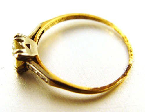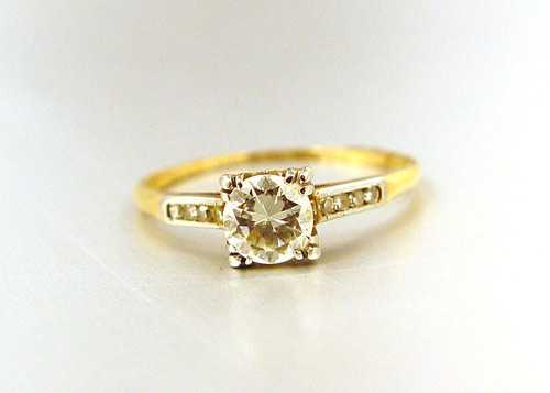 DIAMOND ENGAGEMENT RING: 14K yellow gold ring contains one round transitional cut diamond. Weight: .53 Ct. Approx., rated VS1 in clarity and M in color. Flanked by 8 round single cut diamonds. Weight: .06 Ct. Approx., rated VS in clarity and I-J in color. The center diamond is prong set (18K head) and the small diamonds are channel set. Weight: 1.6 grams. Size 7 3/4