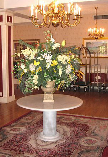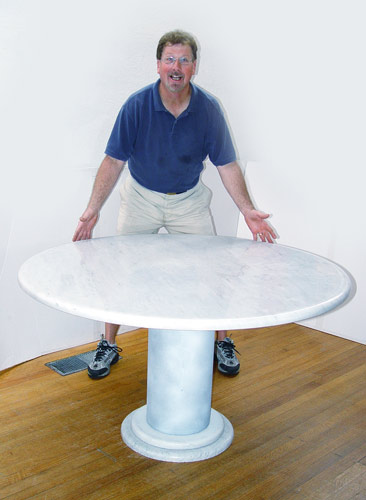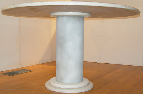 ROUND MARBLE FOYER TABLE: From the Heritage Hotel in downtown St. Petersburg. Round white marble top, measures 50'' dia. The unpolished base measures 28'' high x 18 1/2'' base dia. Note chips on base.