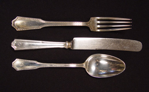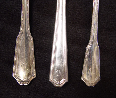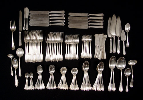 GORHAM ROANOKE STERLING FLATWARE SERVICE: 94 pieces in the Roanoke pattern by Gorham to include 12 dinner forks (7 5/8''), 9 forks (7''), 9 salad forks (6''), 7 cocktail forks (5 3/4''), 8 teaspoons (5 7/8'', note condition), 9 soup spoons (5 1/2''), 10 tablespoons (7 1/8''), 2 serving spoon (8 5/8''), serving spoon (8 5/8''), 6 demitasse spoons (4 1/8''), 10 hollow knives (8 7/8'', note handle on one), hollow knife (9 1/4''), 12 solid butter knives (6''), serving fork (7 1/4''), soup ladle (7 1/8''), cream spoon (5 7/8''), jelly server (6 1/4''), 3 pie servers (10 1/8'', 9 1/2'', 6 1/2''). All pieces monogrammed. Set also comes with 2 Reed & Barton solid butter knives, Whiting cream server, Gorham table spoon, unknown pie server and silverplate Rogers spoon. Approx. 124.7 troy oz.