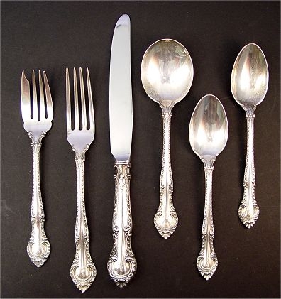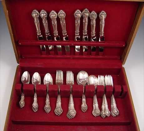 GORHAM STERLING ''ENGLISH GADROON'' FLATWARE SERVICE: 52 pieces to include 8 dinner knives (8 3/4''), 8 dinner knives (7 1/8''), 8 salad forks, 8 soup spoons, and 14 teaspoons. Monogrammed A. Approx 50 troy oz. Comes in wood chest measures 3 1/4'' high 16'' x 11 3/4'', note condition.
