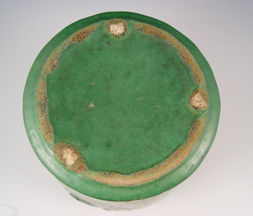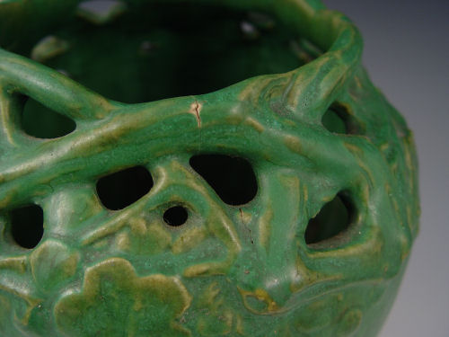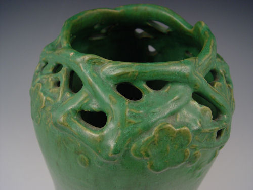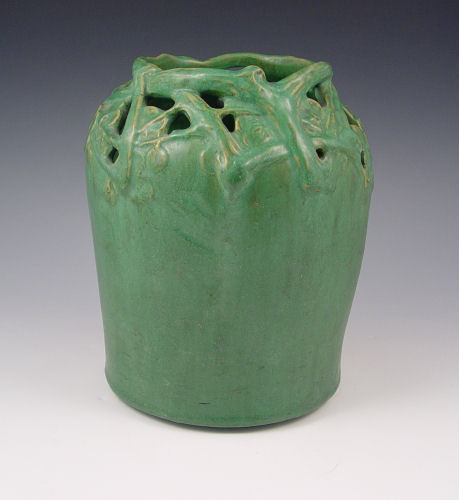 ARTS & CRAFTS MATTE GREEN POTTERY VASE: Reticulated rim in a twig and flower design, 9''h.