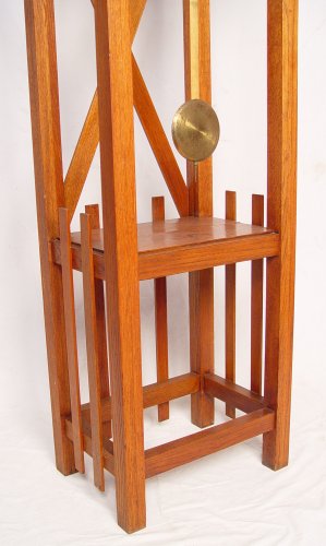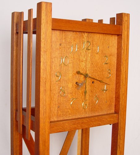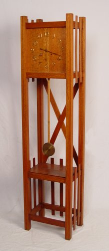 GOLDEN OAK ARTS & CRAFTS GRANDFATHER CLOCK: Unmarked as to maker. Comes with pendulum. Sold in not running condition. Measures 71 1/4'' high x 17'' wide x 12 1/4'' deep.