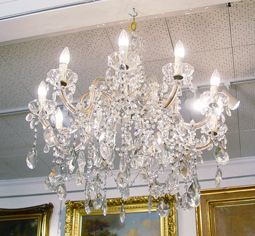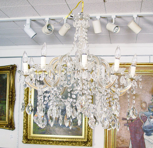 MARIA THERESA CRYSTAL CHANDELIER: A most elegant 10 light chandelier, bent arms dripping in prisms and crystal chains, 27'' high x 28'' dia.