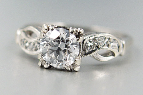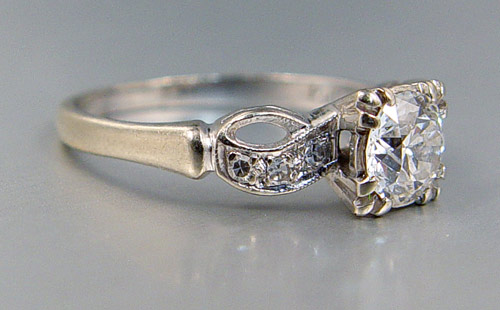 .84 CT OLD EUROPEAN DIAMOND RING: 14K white gold ring centers an approx. .84 Ct Old European round cut diamond, rated VS2 in clarity, H color, no florescence. There are also 6 round single cut diamonds in the setting, approx. .10 Ctw., rated VS clarity and G-H color. The center diamond is prong set. The small diamonds are bead set. 3 grams. Size 7.5. Sold with current Florida Diamond Appraisers GIA graduates appraisal for $5250.