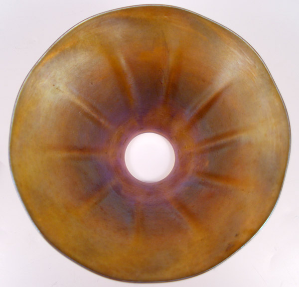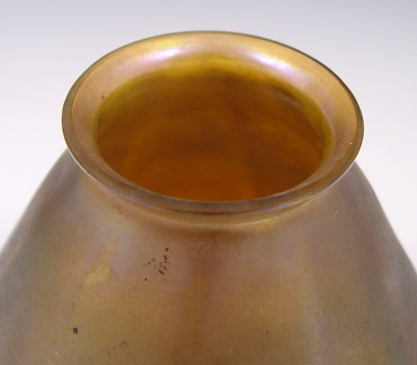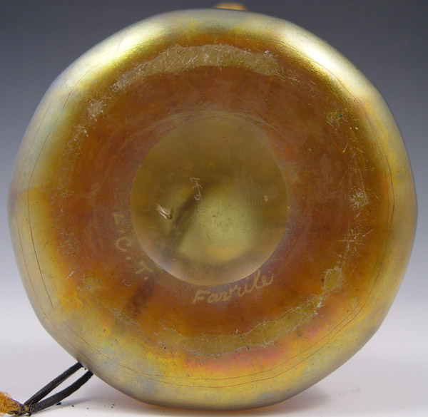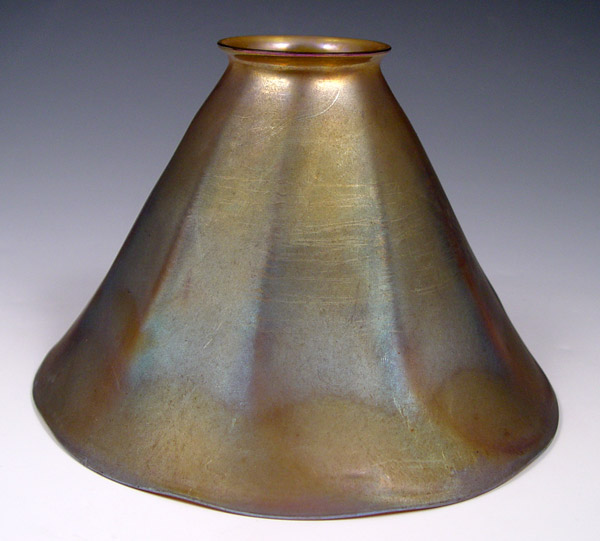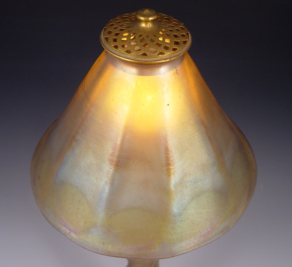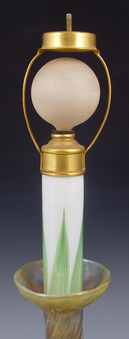 TIFFANY FAVRILE GLASS CANDLESTICK LAMP: Conical glass shade on a twist ribbed candlestick, the glass ''candle'' stem holds the pull chain single socket. Base signed L.C.T. 17'' tall.