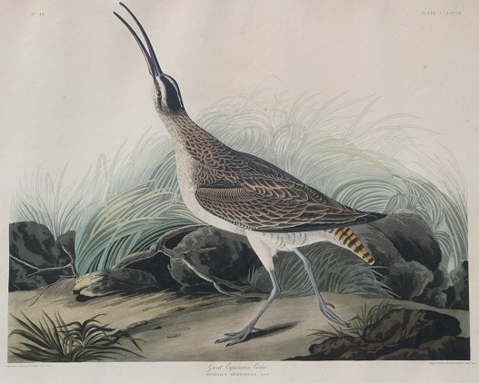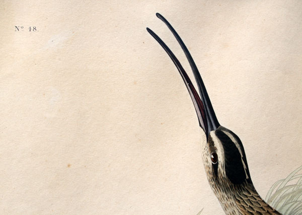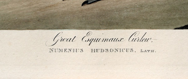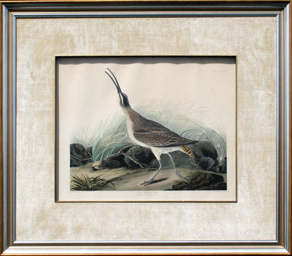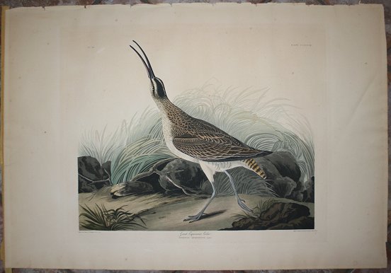 J.J. AUDUBON GREAT ESQUIMAUX CURLEW, HANDCOLORED ENGRAVING WITH AQUATINT PL.CCXXXVII: From John James Audubon's original edition of The Birds of America produced by hand-colored engraving on wove paper, 25 1/2'' x 37 3/4'', marked upper left corner with No. 48, and upper right Plate CCXXXVII; Audubon credit lower left - Drawn from Nature by J.J. Audubon, F.R.S.F.L.S., and lower right - Engraved, Printed and Coloured by R. Havell, London 1835. Bird's name centered below image Great Esquimaux Curlew, J. Whatman Turkey Mill watermark, the most famous and prized of the Original Audubon prints are the aquatints produced under the artist's supervision between 1826 and 1838. Based on Audubon's watercolor and ink drawings, copper plates were engraved using acid and resin, and black ink prints were made on ''double elephant'' sized paper, 27 1/2 x 39 1/2 inches, to depict the birds in full life-size. The paper was made by James Whatman at Turkey Mill in Kent County England. This paper was the finest available and bea