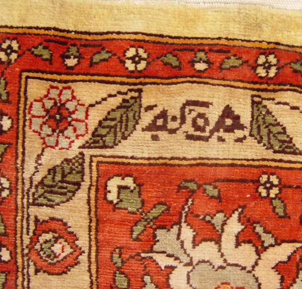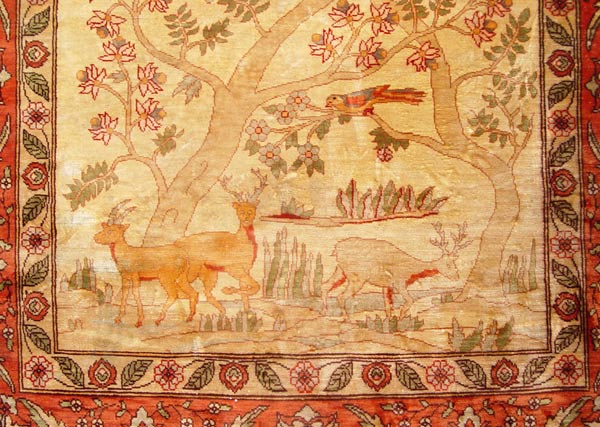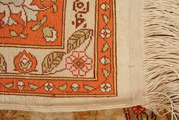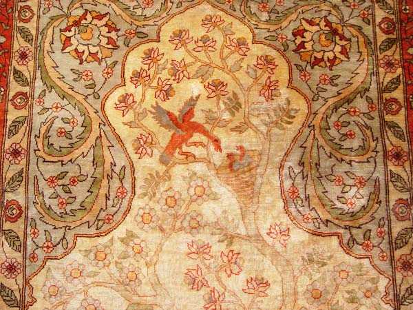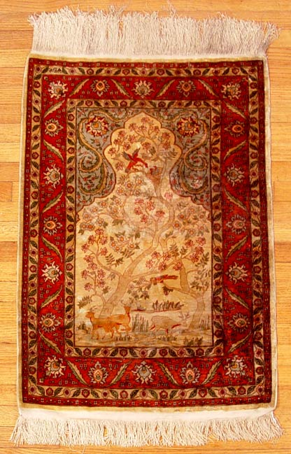 TURKISH HEREKE FINE SILK TREE OF LIFE PRAYER RUG: An exceptional signed silk pictorial, approx. 3'4'' x 2'2''.