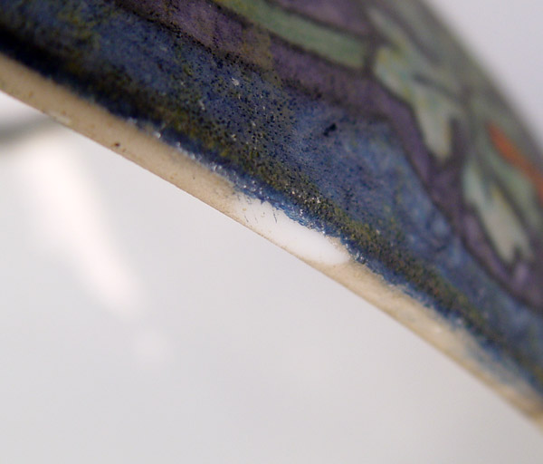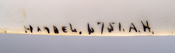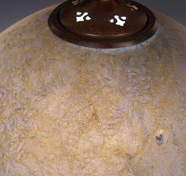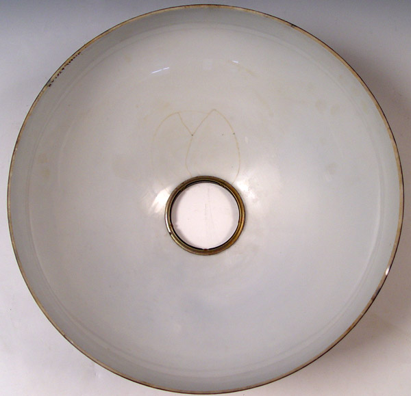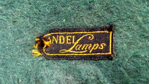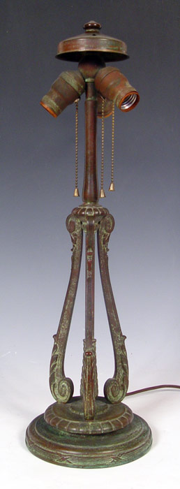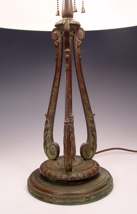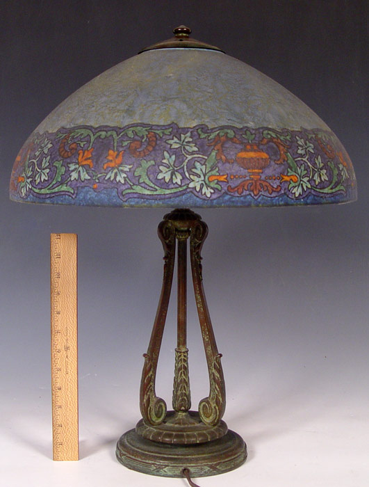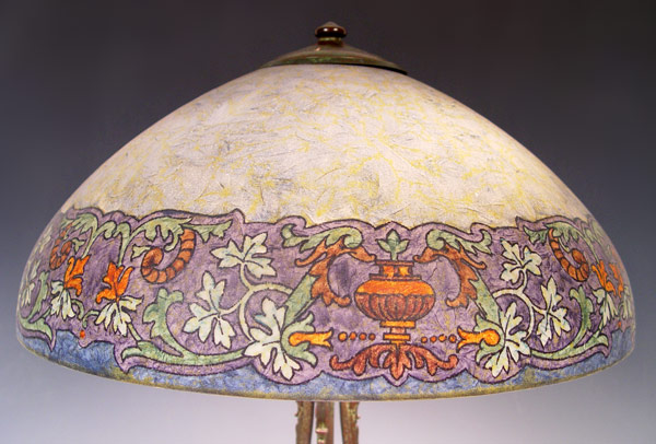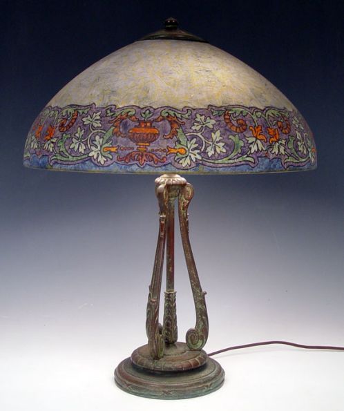 SIGNED HANDEL TABLE LAMP 6751: Urn and floral border on chipped ice shade. Signed on shade Handel 6751 A.H. and heat cap. Original Handel cloth tag on tri column base. Shade measures 7 1/2'' h. x 17 3/4 dia. Base measures 22 1/4'' h.