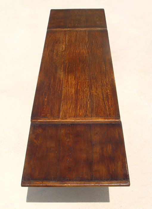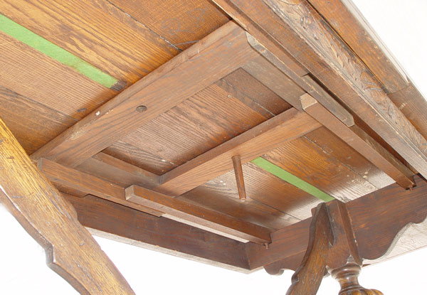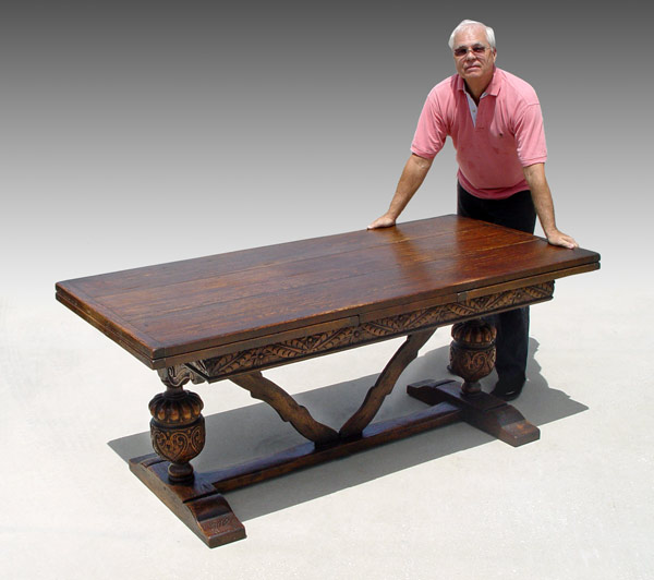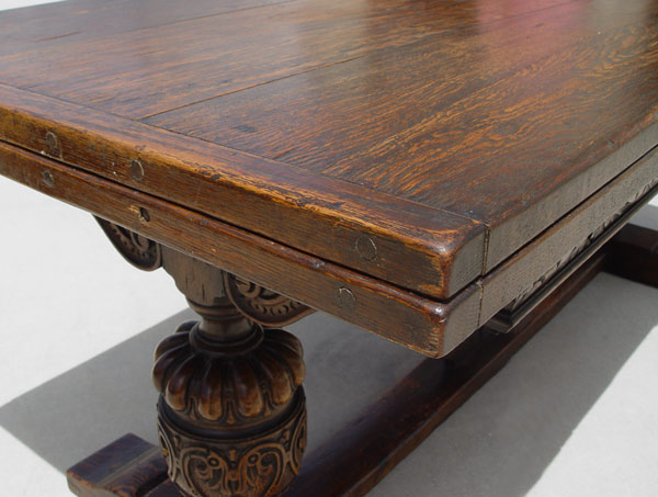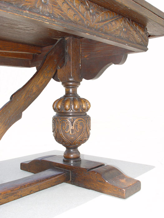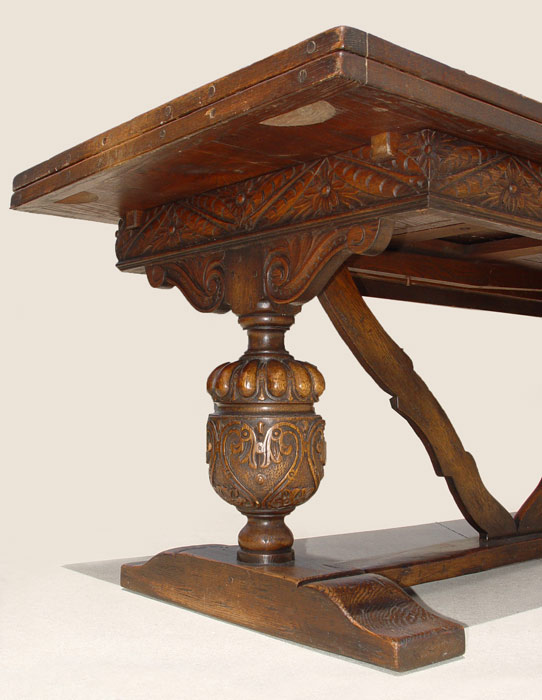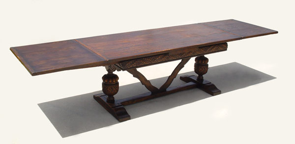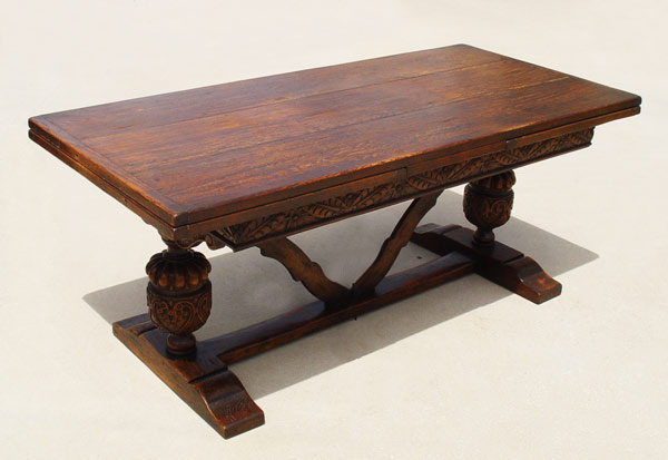 EARLY 19TH C JACOBEAN OAK DRAW LEAF TRESTLE TABLE: Three board top with bread board ends, Richly carved apron, ovoid baluster supports with V shaped stretcher, shoe feet. 30'' tall x 34'' x 72'' long, extends to 128''.