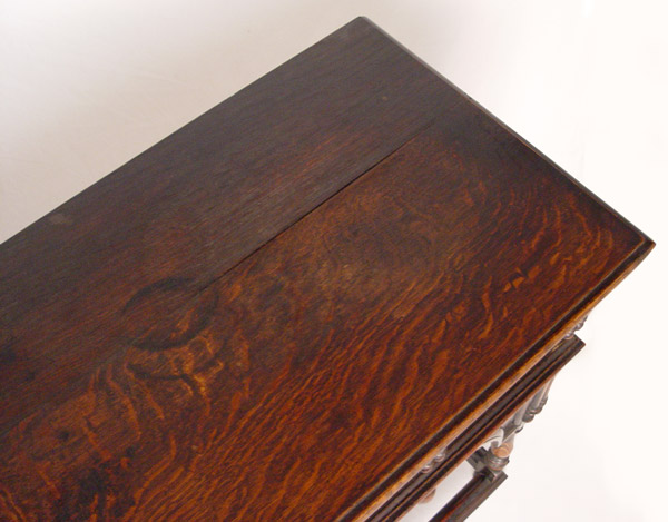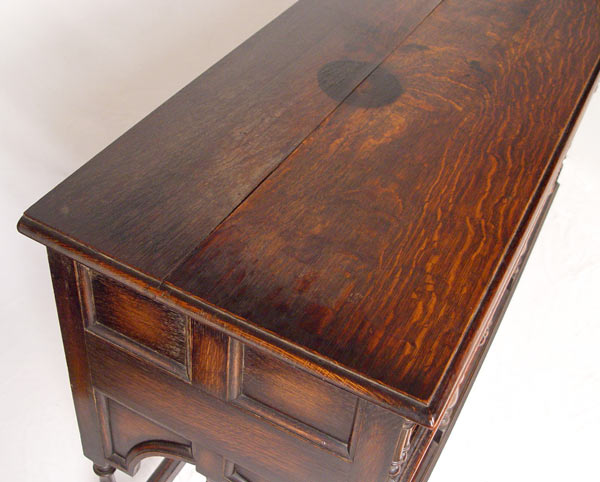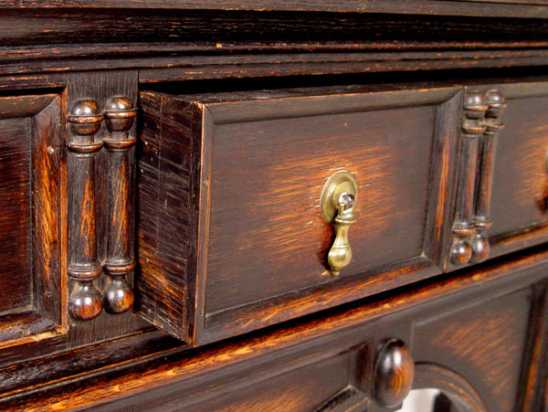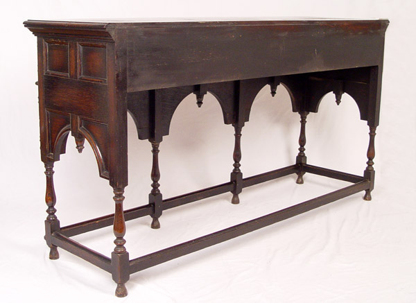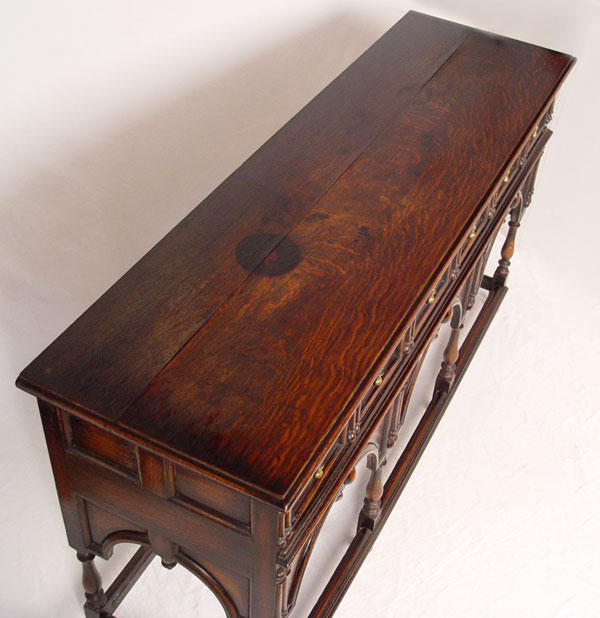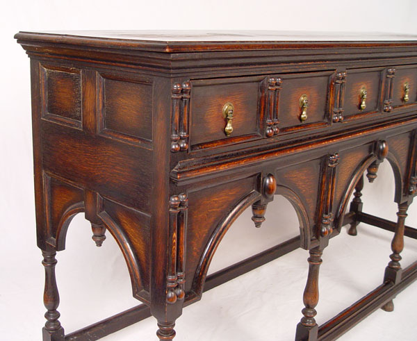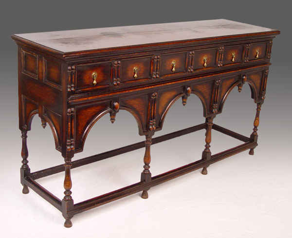 DARK OAK CARVED JACOBEAN SIDEBOARD: 3 molded drawers over architectural arches supported by fine turnings and stretcher base. Fine brass drop pulls. Decorated with acorn finials. 36'' h. x 67'' x 20''.