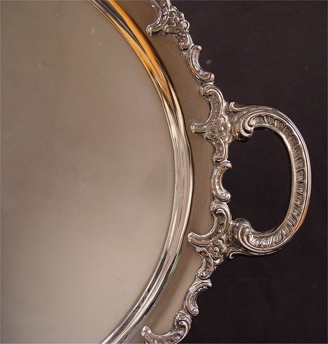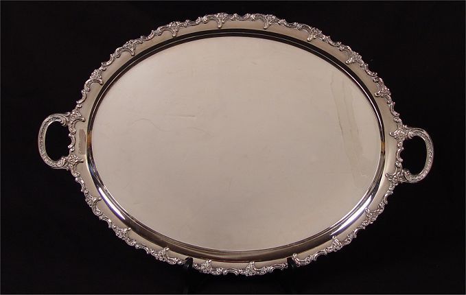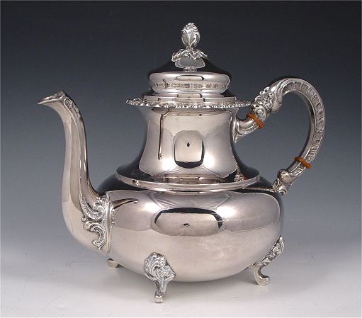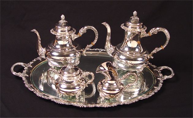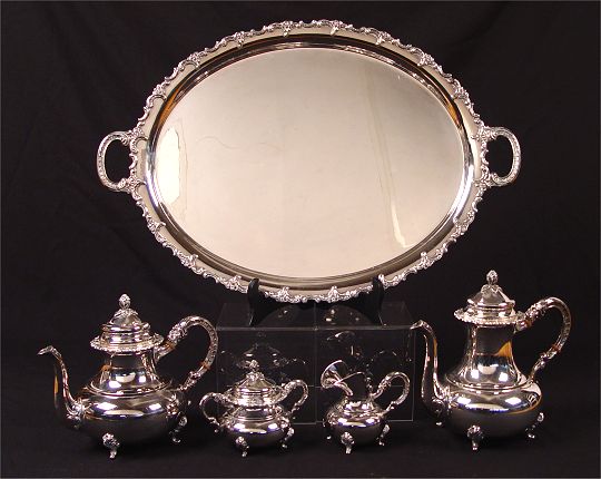 GAYER & KRAUSS 4 PIECE STERLING COFFEE TEA SERVICE: To include 1) Coffee pot with hinged lid and rose finial. 10'' h. x 11 1/2''. 2) Teapot with hinged lid and rose finial. 8 3/4'' h. x 11 1/2'' 3) Covered sugar, rose finial. 5'' h. x 6 1/2'' 4) Open creamer, 4 3/4''h x 5 1/2''. Set comes with silverplate 2 handled tray with glass insert for bottom, note chips to glass. Approx 75.8 troy oz.