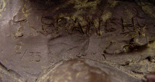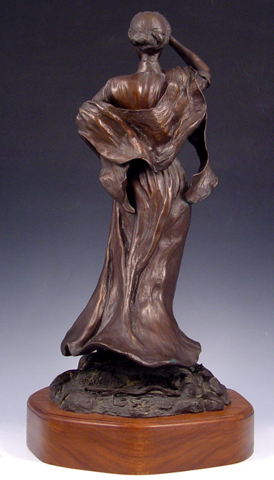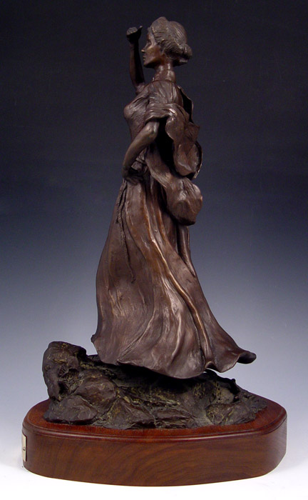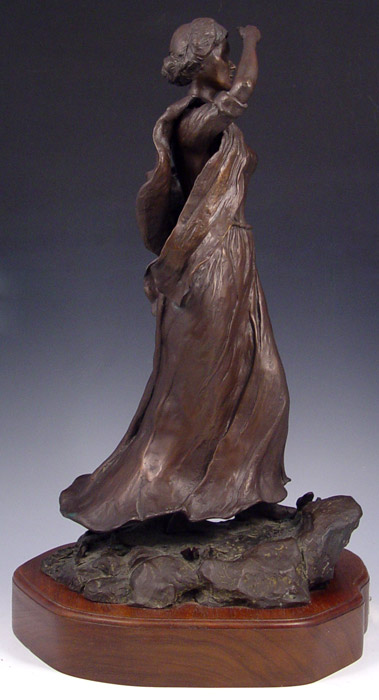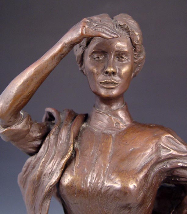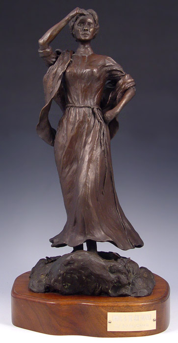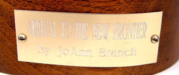 BRANCH, Joann, (American, 20th C.): ''Arrival to the New Frontier'', Bronze, depicts a woman looking out to the horizon, 16'' h, incised signature, numbered 2 of 35, affixed to polished walnut plinth, the approximate height of the sculpture is 12'', placed on a rotating stand.