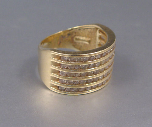 FIVE WIDE BAND 2.25 CTW DIAMOND RING: 14K yellow gold ring contains 75 round brilliant cut diamonds, approx. 2.25 Ct. The diamonds average I1 in clarity and K-L in color. The diamonds are channel set. Weight: 8.4 grams. Size: 8.5