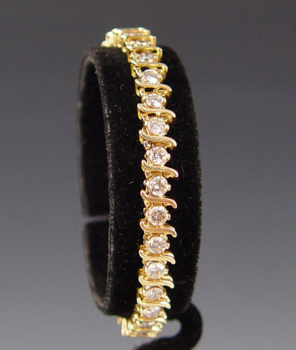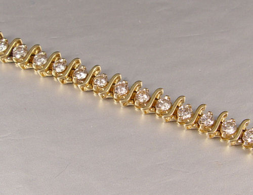 5 CT DIAMOND TENNIS BRACELET: 14K yellow gold ''S'' link tennis bracelet of 35 round brilliant cut diamonds, approx. 5 Ctw., average SI-I1 in clarity and Light Brown in color. The diamonds are prong set. Weight 16.5 grams. Length 7''. Sold with current Florida Diamond Appraisers GIA graduates appraisal for $4,200. Est. $2000/4000**