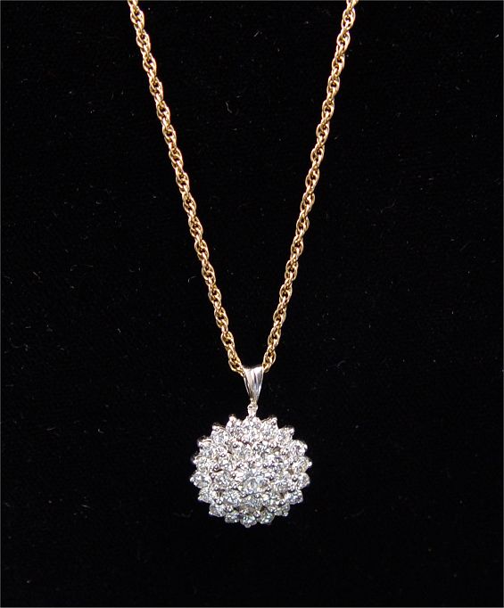 14K DIAMOND SUNBURST PENDANT: 14K white gold pendant contains twenty eight round brilliant cut diamonds, approx. weight 1.50 Ct. The diamonds average VS in clarity and range from I to L in color. The diamonds are prong set. 14K yellow gold 18'' fine rope chain. Weight: 4.6 grams. Est. $800/1200**
