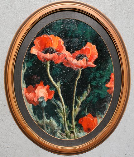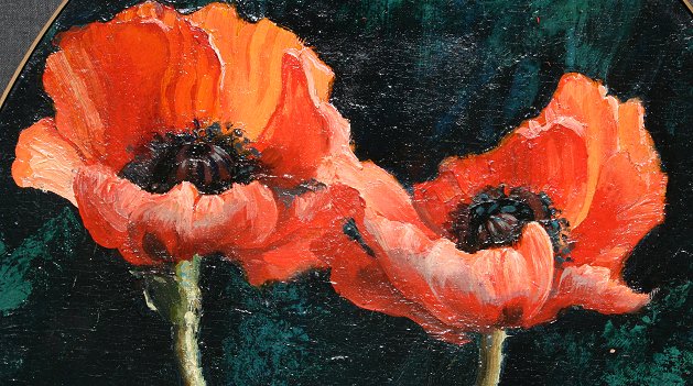 SMITH, Gladys Nelson, (American, 1890-1980): Poppies, Still Life, Oil/Canvas/Board, 20'' x 16'' oval, monogrammed GNS, framed, 22'' x 18''. Studied under W.A. Griffith at U Kansas, at the Art Institute of Chicago, the Art Students League, and at the Corcoran School of Art under Edmund C. Tarbell. Est. $1500/2500**