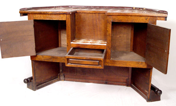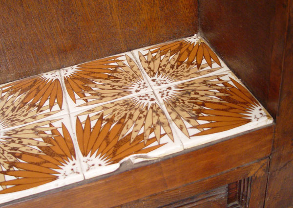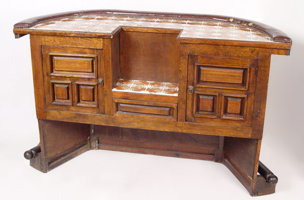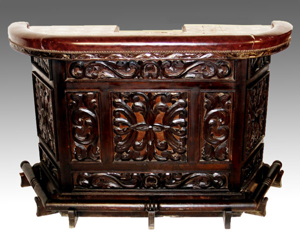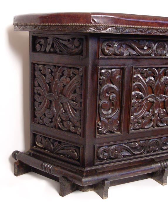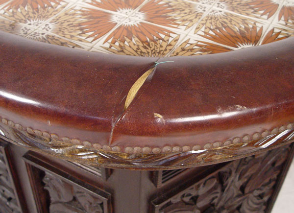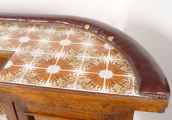 ITALIAN CARVED TILE TOP BAR: Carved base with red leather trim, floral pattern tile top. Carved foot rail. 2 doors and single drawer on back. Measures 45'' h x 74'' x 25''