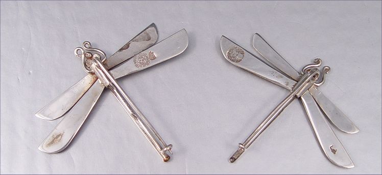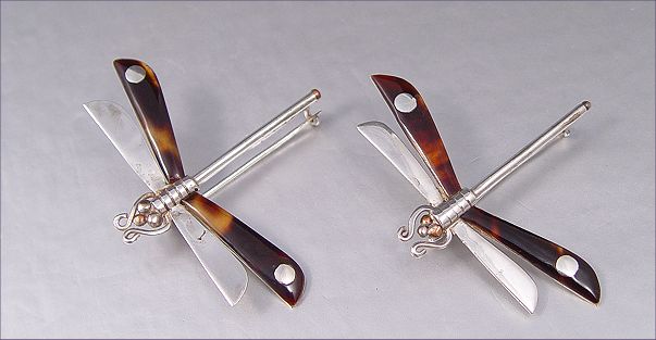 TWO WILLIAM SPRATLING MEXICAN SILVER DRAGONFLY PINS: Sterling and tortoise shell construction with copper eyes. Marked Spratling on wings. 1 3/4'' x 2 3/8''.