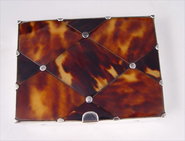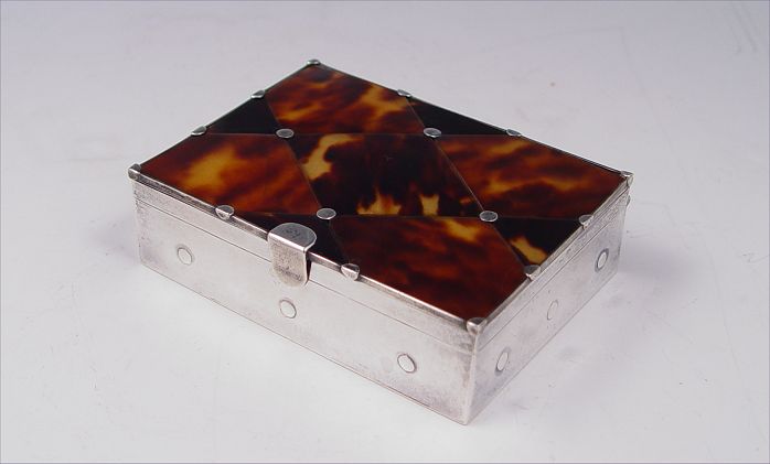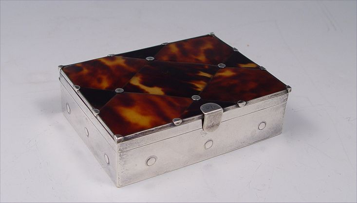 WILLIAM SPRATLING MEXICAN STERLING & TORTOISE SHELL BOX: Sterling box with lid covered in tortoiseshell ? panels. Hinged lid. Sold with the tortoiseshell snuff spoon. Bears the hallmark of Marked with Spratling hallmarks. Measures 1'' x 3 1/2'' x 2 3/8''.