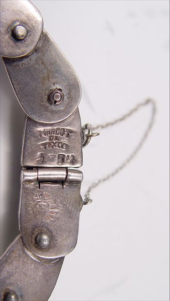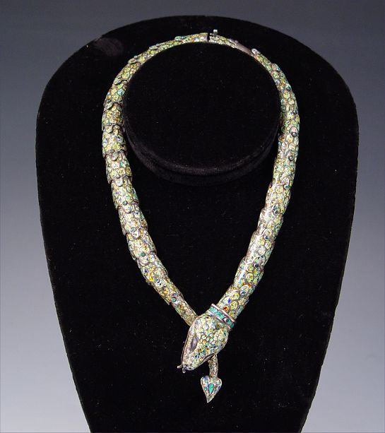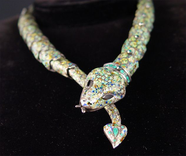 MARGO DE TAXCO ARTICULATED MEXICAN STERLING SNAKE COLLAR NECKLACE: Articulated snake grasping his own tail. Enameled ''scales'' and head highlighted with green paste stones. Clasp is at the back with a safety chain. Approx. 14 1/4'' l. Well signed.
