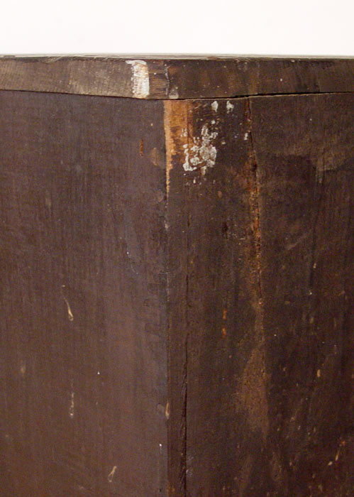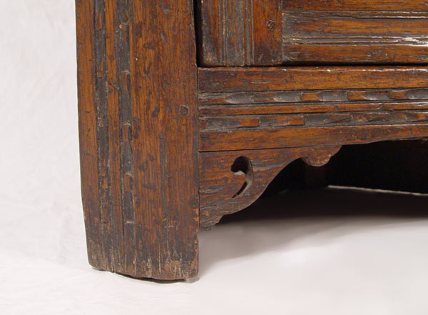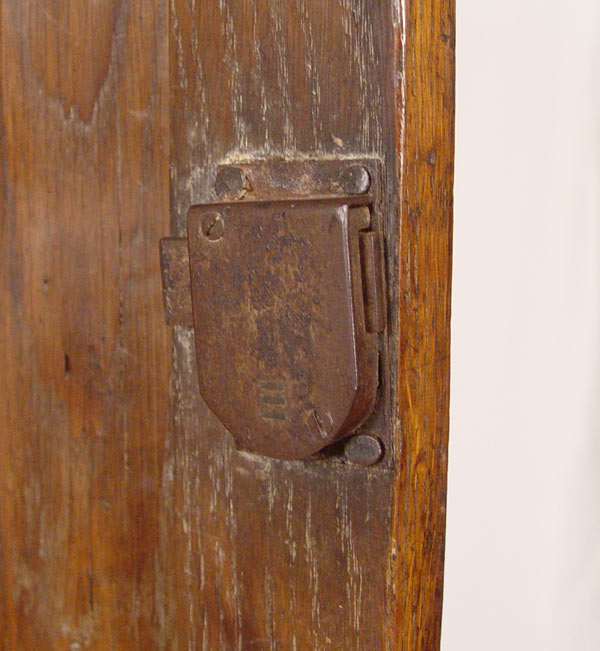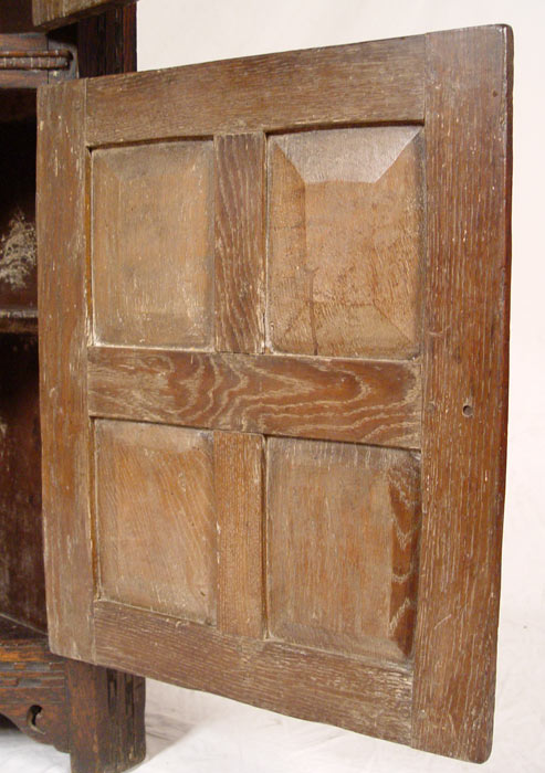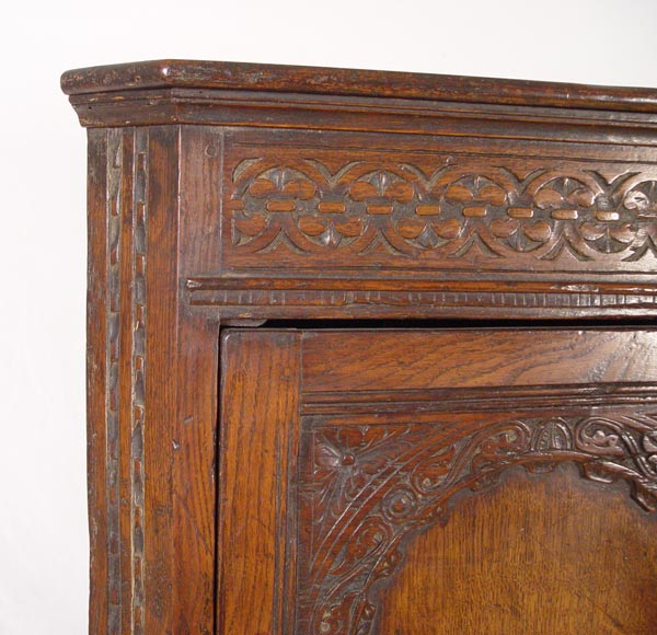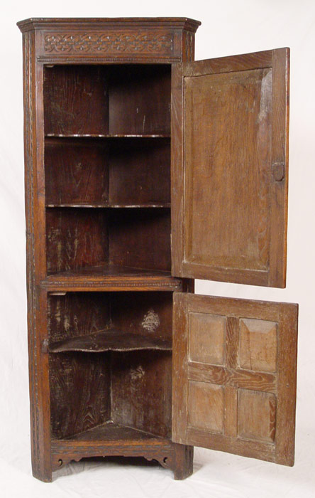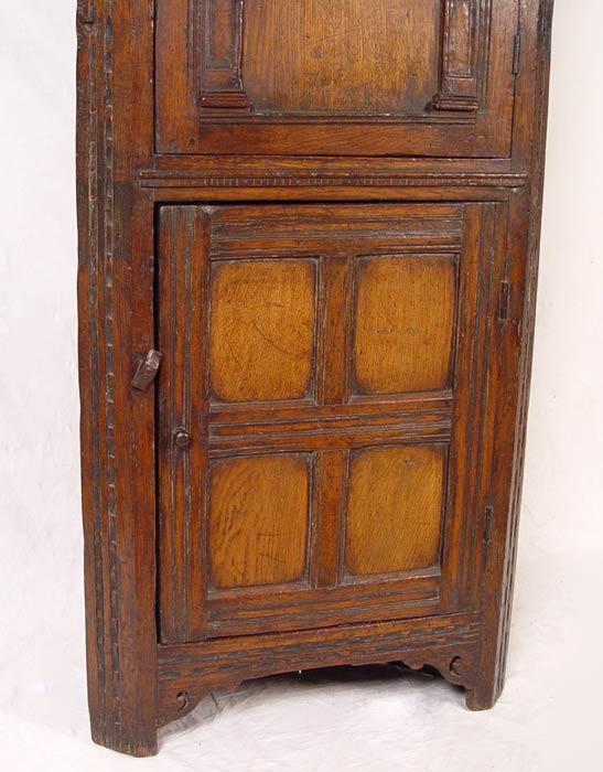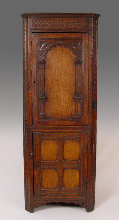 LARGE CARVED 18TH C. JACOBEAN CORNER CUPBOARD: Single upper arched panel door fitted with 2 interior shelves. Base has single 4 panel door with one interior shelf. 73'' h. x 28 1/2'' x 17''. Eileen & Seton Thompson Estate.