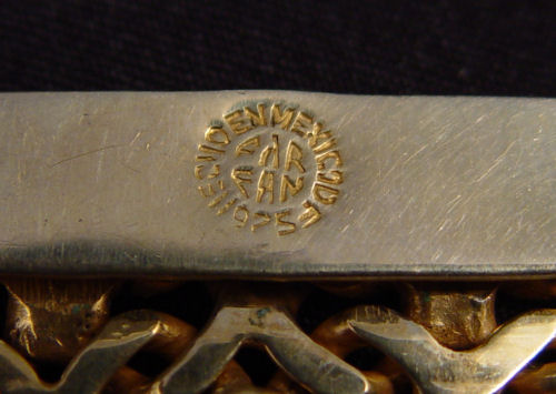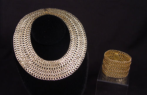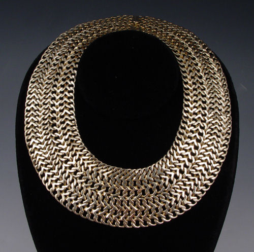 VINTAGE MEXICAN STERLING BRACELET AND NECKLACE BY FAR FAN: 1 3/4'' extra wide collar necklace and bracelet. Vermeil, both pieces bear the hallmark of the Mexico City manufacturer Far Fan. Bracelet is 7 1/4'' length. Necklace 4 1/4'' dia. at center, 12'' length. Approx. 10.2 troy oz.