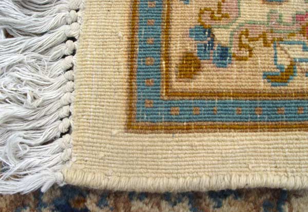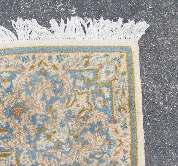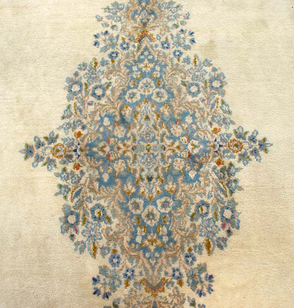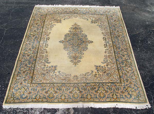 HAND TIED CREAM KERMAN CARPET: Approx 11' 6'' x 8' 7. Open cream field with medallion center, blue border. Ca. 2nd quarter 20th C.
