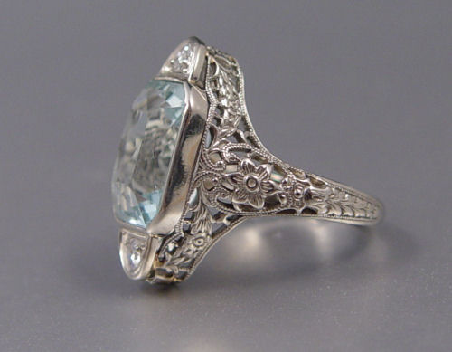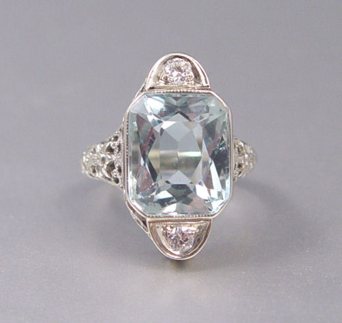 6.75 CT AQUAMARINE FILIGREE RING WITH DIAMONDS: 18K white gold filigree ring contains one rectangular French cut aquamarine. Weight: 6.75 Ct. Approx. Rated VS in clarity (Type I), vslgB in Hue, 2 in Tone and 2 in Saturation. Set with two round full cut diamonds. Weight: .15 Ct. Approx. The diamonds average VS in clarity and H-I in color. The aquamarine is bezel set. The diamonds are bead set. Weight: 5.1 grams. Size: 5.5 Est. $600/900**