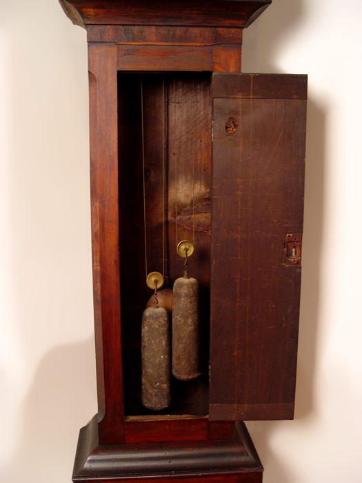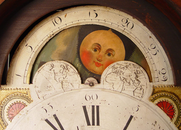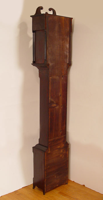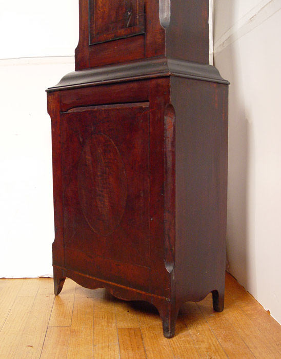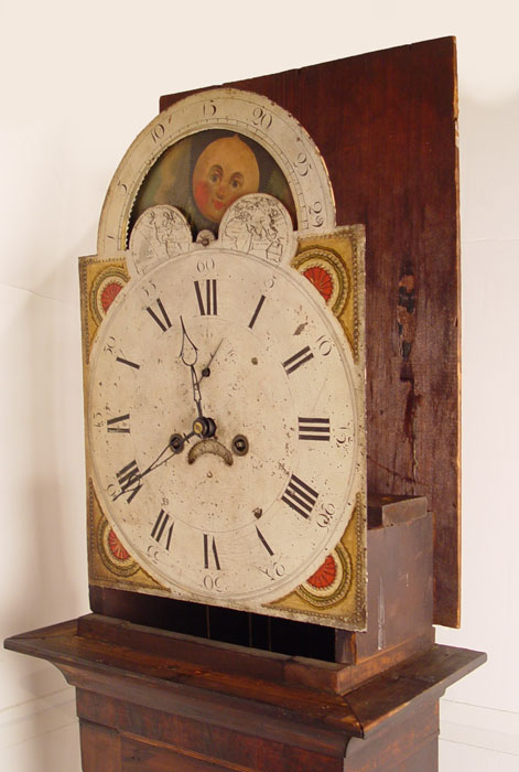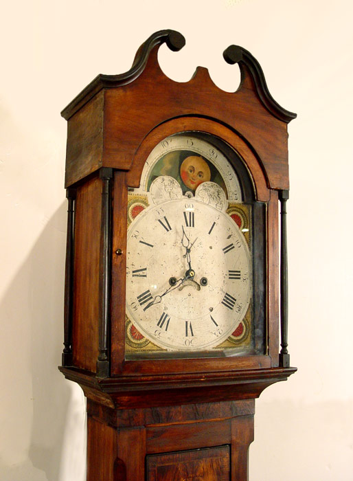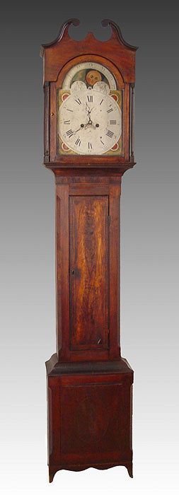 EARLY 19TH CENTURY FLAME MAHOGANY LONGCASE CLOCK: Circa 1810-1830, painted metal face with sun and moon dial, with second hand and date movement as well. Crank, pendulum and 2 weights. Unsigned on face or movement. Mahogany case with broken arch pediment, ebony columns, string inlay on door. 93 1/8'' h. x 17 1/2'' x 9 1/2''.