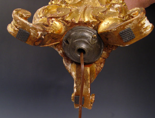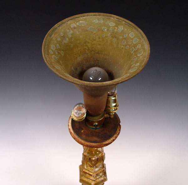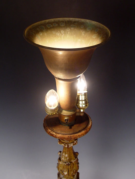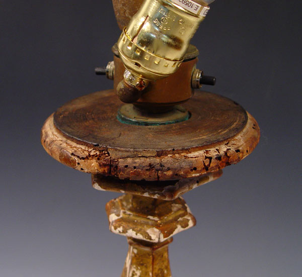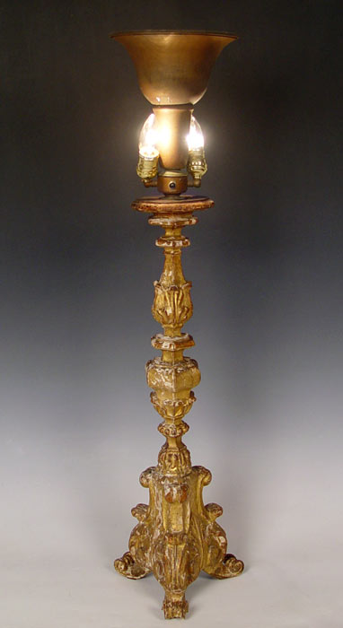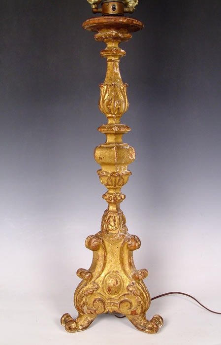 EARLY ITALIAN GILT WOOD ALTAR CANDLE STICK: Tall carved, gesso and gilded candle stick converted to a lamp. 38 1/2'' tall x 10'' dia.