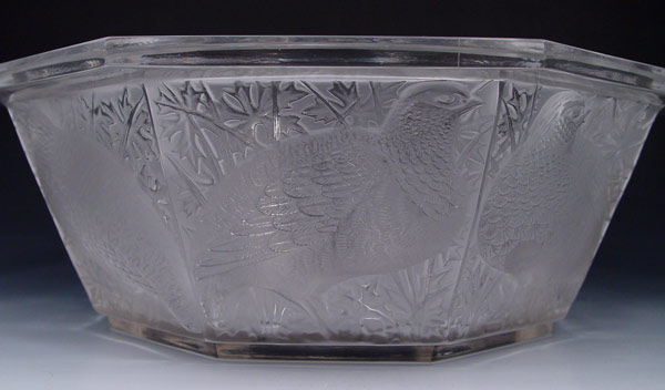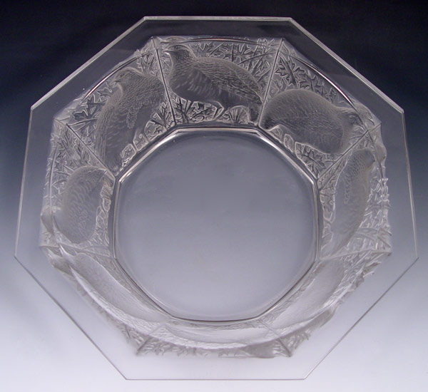LALIQUE PARTRIDGE OCTAGONAL CENTER BOWL: Signed Lalique, France. Measures 4'' h. x 11 1/2''