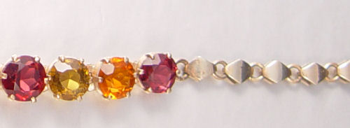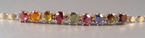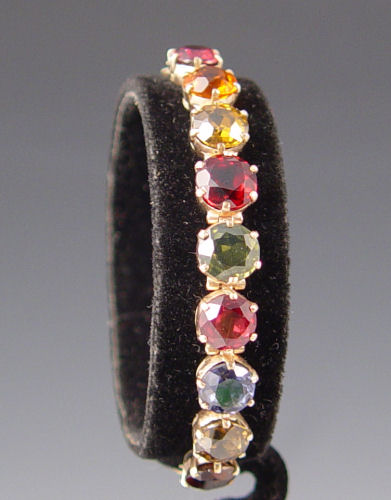 CA. 1935-1945 NATURAL GEMSTONE ROSE GOLD BRACELET: 9K rose gold bracelet contains 9 native cut natural gemstones, probably tourmaline or sapphire, total weight approx. 10 Ct. The gemstones are prong set. Locking closure with figure eight safety clasp. 6.5'' length. Weight 10.4 grams.