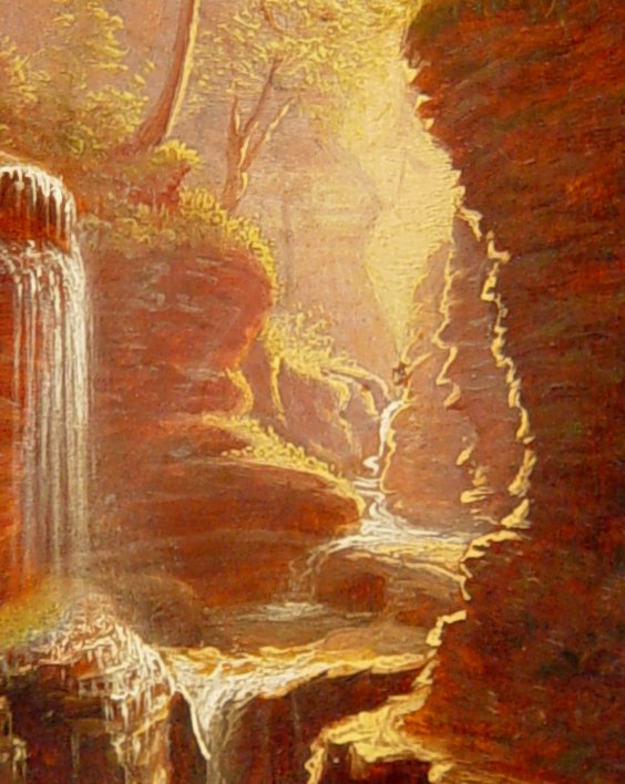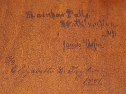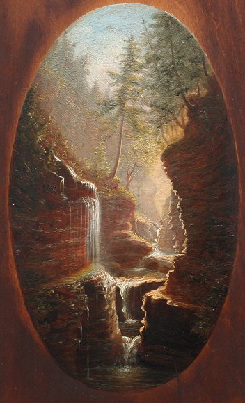 HOPE, James, (American, 1818-1892): ''Rainbow Falls, Watkins Glen, NY'', Oil/Wood Panel, 8'' x 5'', signed, titled and dated 1881 verso, dedicated to Elizabeth L. Taylor, encased in carved and painted frame, 10 1/2'' x 8''. Est. $800/1200**