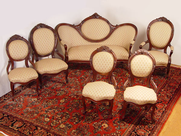 6 PIECE VICTORIAN WALNUT PARLOR SET: Good quality with gratefully carved curved frame and simple woven upholstery. Medallion back SETTEE, 66'' long x 31'' deep x 41'' tall. GENTS high back parlor chair, 42'' tall x 27'' wide x 30'' deep. LADIES parlor chair, 40'' x 24'' x 27'' and 3 SIDE CHAIRS. 38'' x 19 1/2'' x 22''.