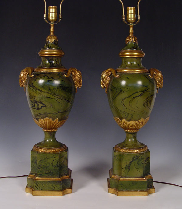 PAIR OF ITALIAN RAMS HEAD LAMPS: Painted faux marble finish over plaster, gilt rams heads. Restoration along rim. Approx.. 40''h. overall.