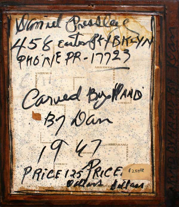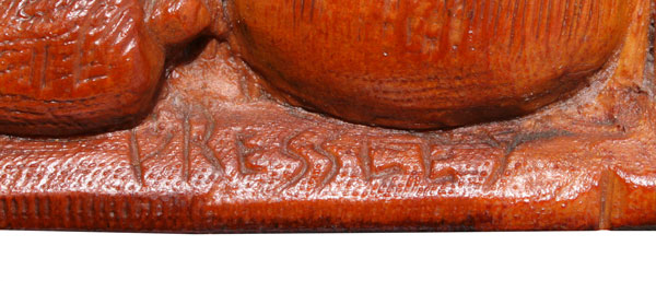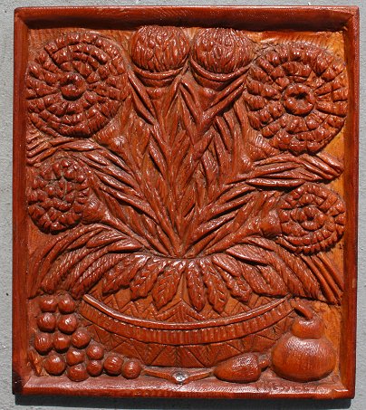 PRESSLEY, Daniel, (American, 1918-1971): Still Life of Flowers and Fruit, Woodcarving, 18'' x 15 1/2'', signed lower right, signed verso w/ artist's address, dated 1967. Est. $1500/2500**