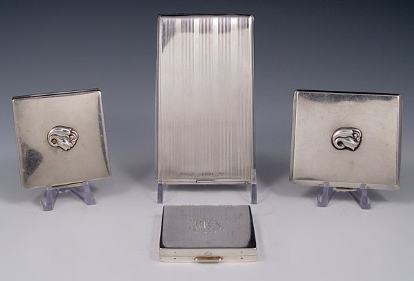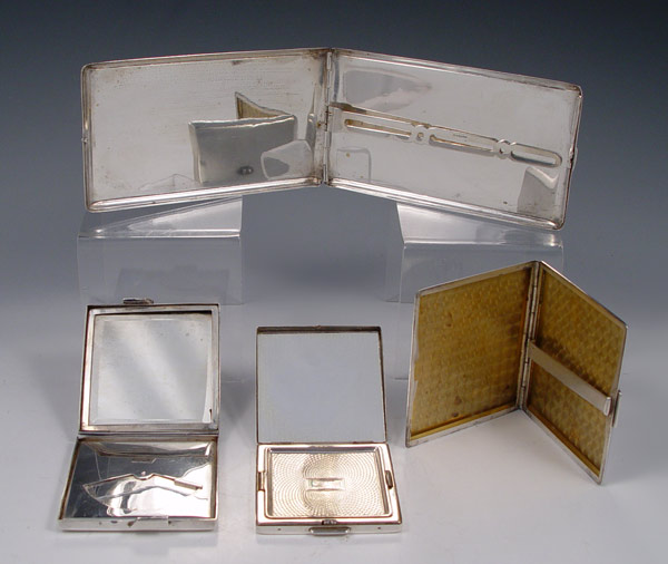 COLLECTION OF STERLING COMPACT / CARD CASES: To include 1) Napier elongated card case, 5'' x 2 7/8''. 2) R. Blackington card case, applied tulip decoration. 3 1/8'' x 2 3/4''. 3) R. Blackington compact, note hinge, 2 1/2'' x 2''.. 4) Majestic compact, monogrammed, 2 1/4'' x 2 1/4''.